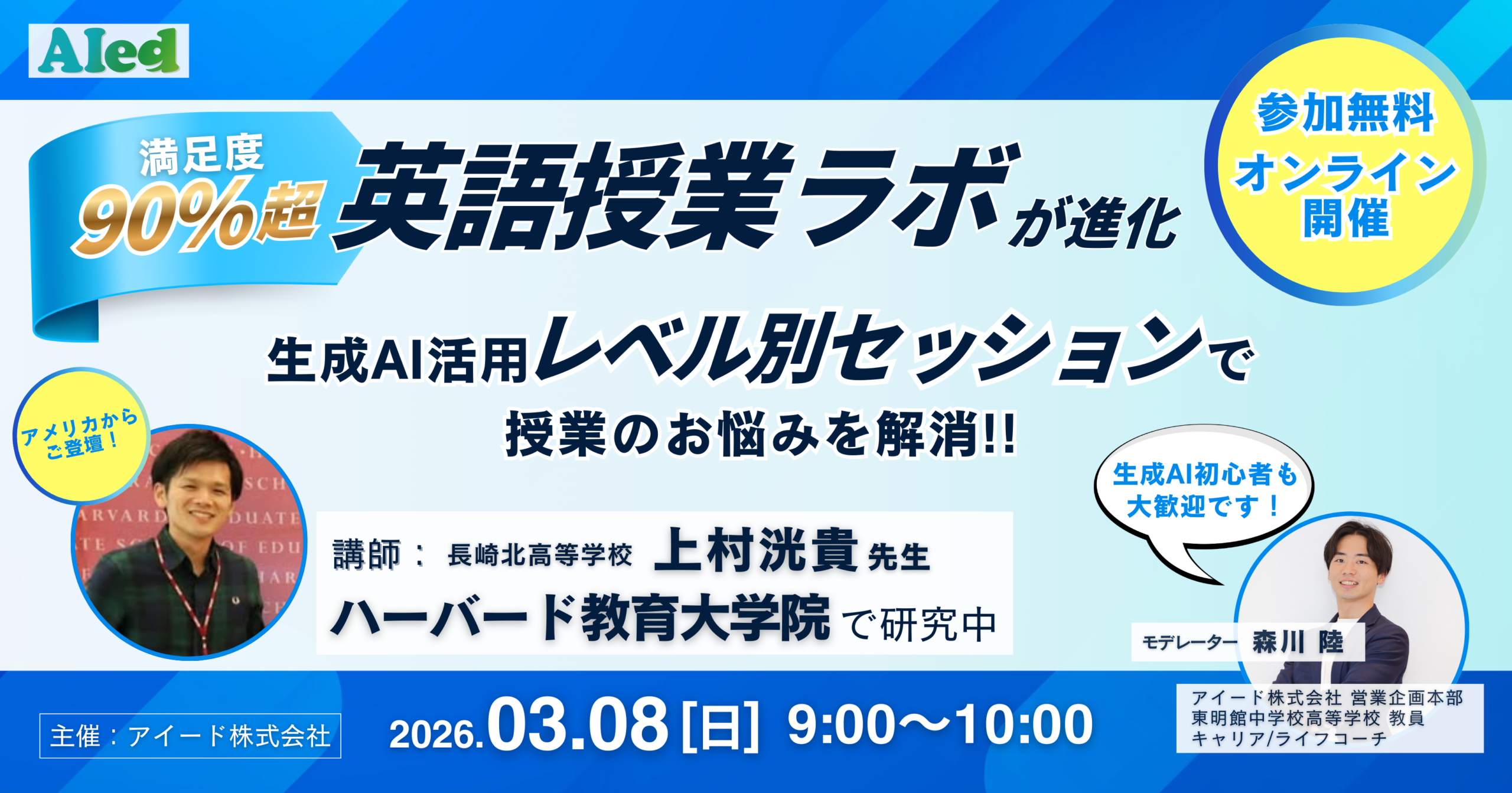 英語教育分野でテクノロジーを活用したソリューションを展開するアイード株式会社(本社:東京都新宿区、代表取締役:窪田優希、以下「アイード」)は、ハーバード教育大学院で研究する上村洸貴先生(長崎北高校教諭)とともに、生成AIを活用した英語授業の実践を共有・議論するオンラインイベント「英語授業ラボ」を開催します。
